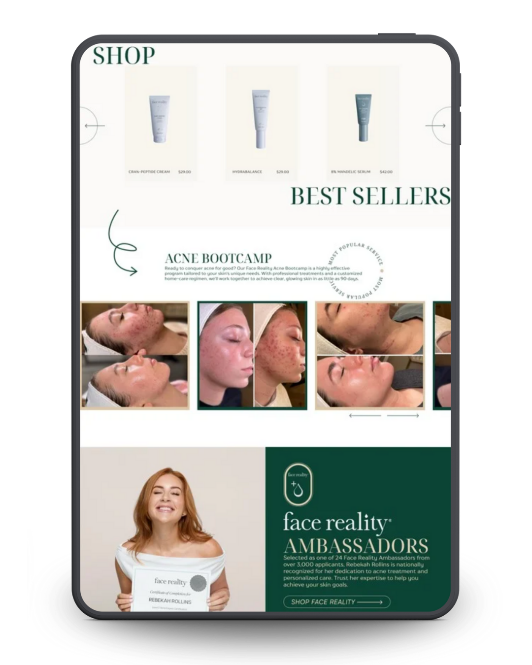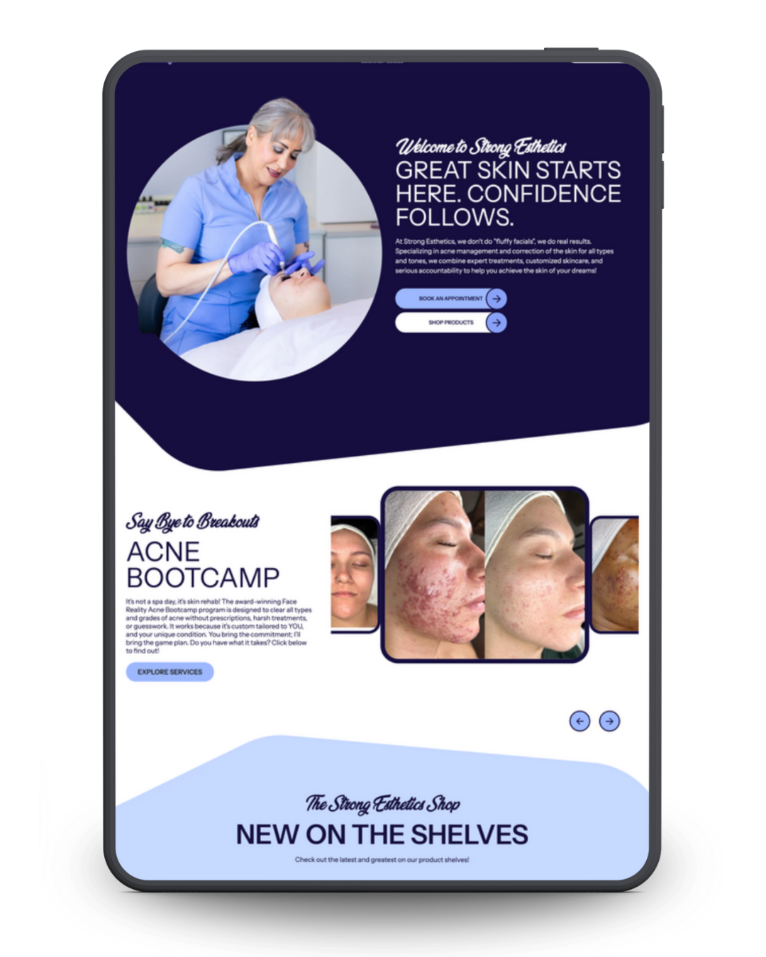 Every layout, page, and flow is designed with conversion in mind, making it easy for clients to shop skincare, reorder products, and take action without friction.