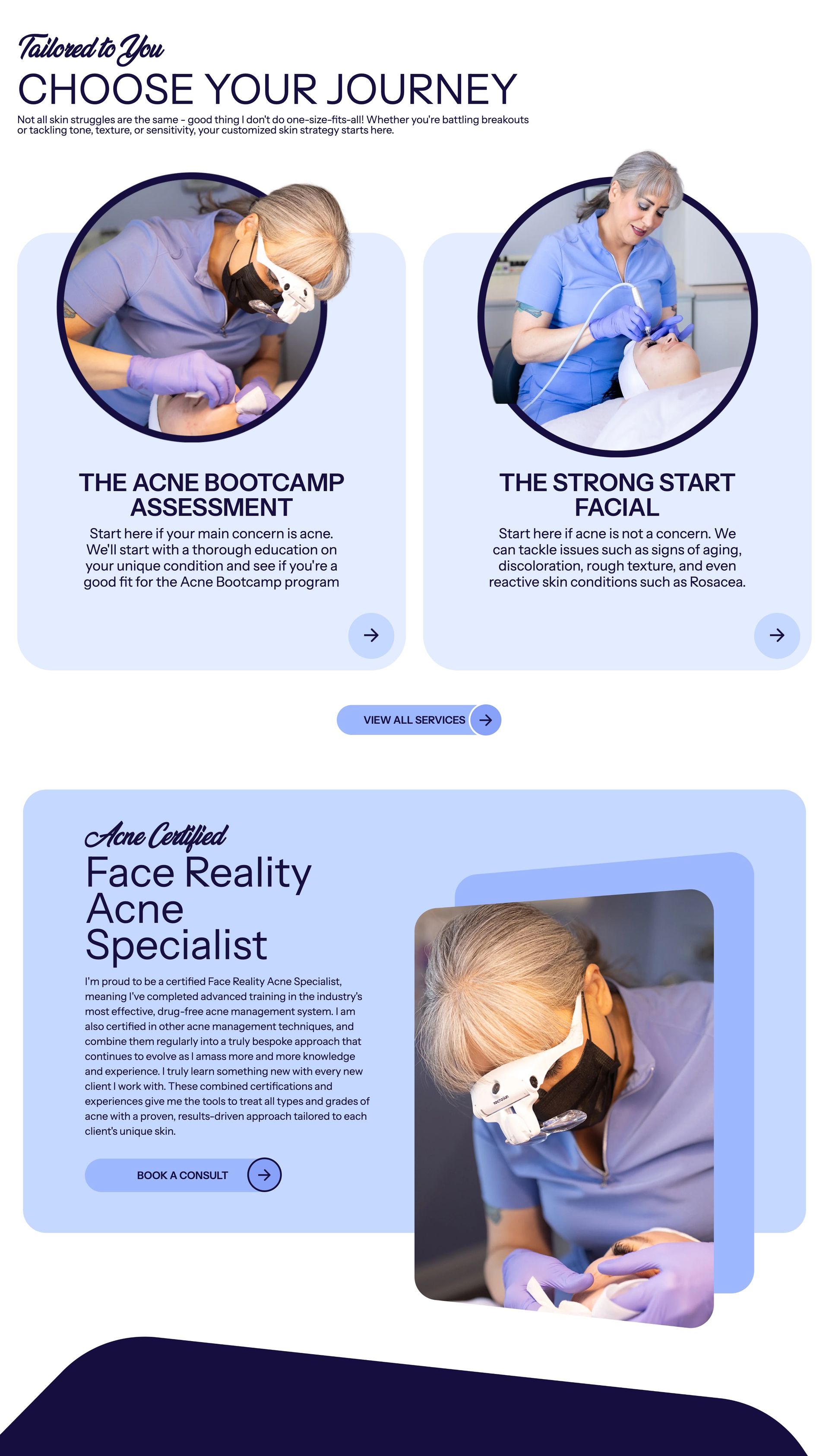 Her Acne Bootcamp is the signature offer, and the site treats it that way. Before and after results are front and center because when your work is that good, you lead with it. The Bootcamp also gets its own dedicated page, which does double duty: it gives prospects everything they need to say yes, and it signals to anyone landing on the site that this esthetician has a proven, structured program not just a fluffy facial menu.