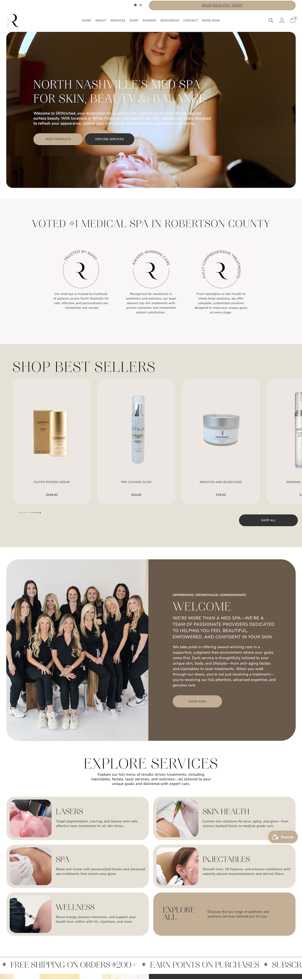 SKINriched is a multi-location medspa offering everything from injectables and laser to wellness consults and curated skincare. When they reached out to us, they told us exactly what wasn’t working: their website navigation was messy, their eCommerce felt clunky, and they didn’t have space to showcase results, reviews, or education. They needed a site that matched the elevated client experience they deliver in person.